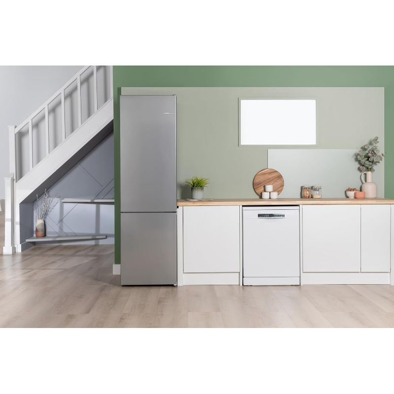 El Bosch KGN392LAF es un frigorífico combi de libre instalación con acabado en acero inoxidable, diseñado para hogares que buscan eficiencia energética, capacidad de almacenamiento y tecnología de conservación avanzada. Con una altura de 2,03 metros y una capacidad total de 363 litros, es adecuado para familias medianas o grandes que requieren espacio organizado y un funcionamiento sin mantenimiento de descongelación.