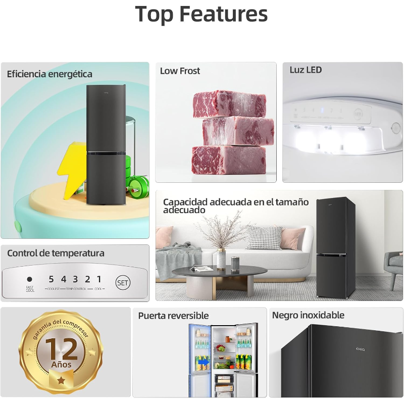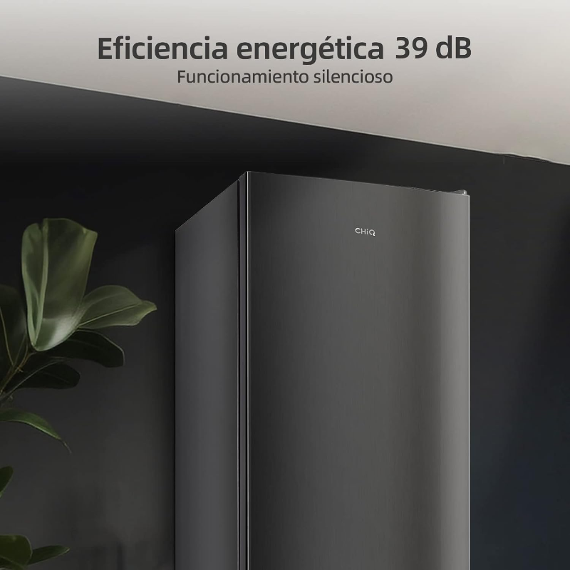 Este frigorífico CHiQ es una nevera con congelador en la parte superior, ideal para cocinas pequeñas. Tiene espacio suficiente para guardar comida de una o dos personas, enfría bien, hace poco ruido y gasta poca electricidad. Es fácil de usar, se adapta a cualquier rincón y tiene un diseño moderno en color acero inoxidable.