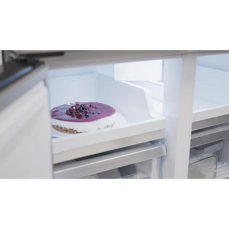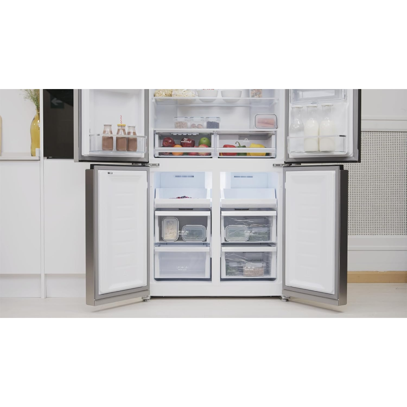 Este frigorífico tiene mucho espacio para guardar comida, no hace escarcha, enfría de forma uniforme, gasta poca energía y es fácil de usar. Tiene cuatro puertas para organizar mejor los alimentos y un diseño moderno que queda bien en cualquier cocina. Ideal para familias o personas que necesitan guardar muchos productos frescos y congelados.