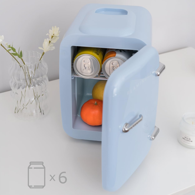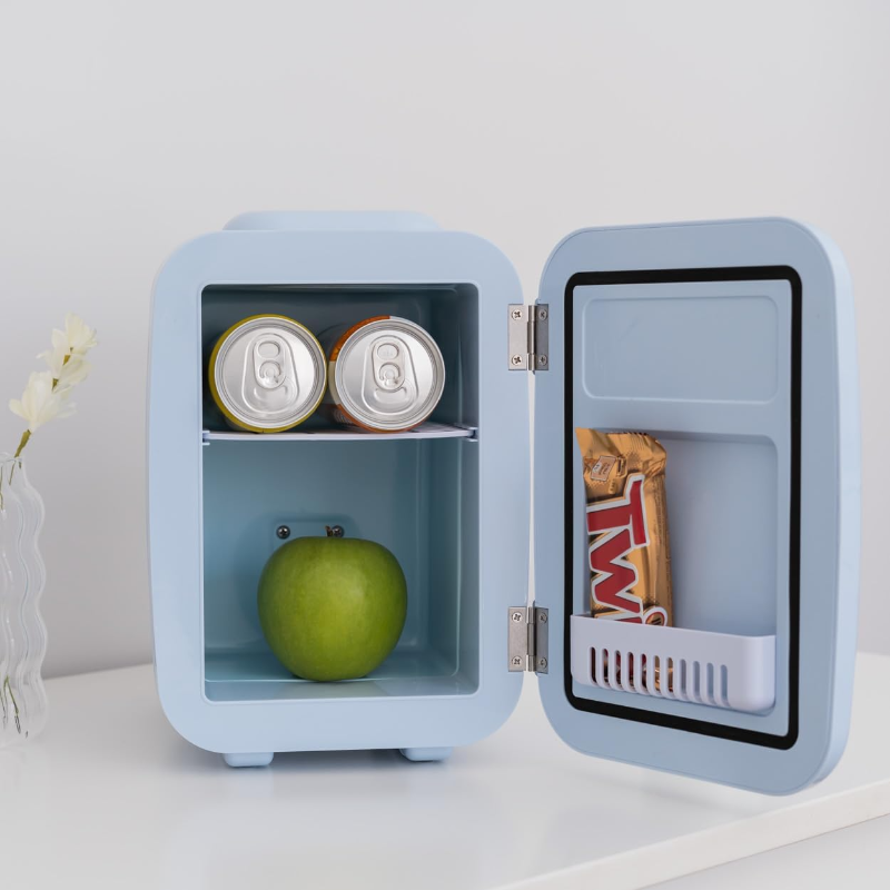 Es una mini nevera portátil que enfría o calienta, se puede usar en casa o en el coche, guarda hasta 6 latas, es fácil de llevar y no hace ruido. Ideal para bebidas, comida, maquillaje o medicamentos.