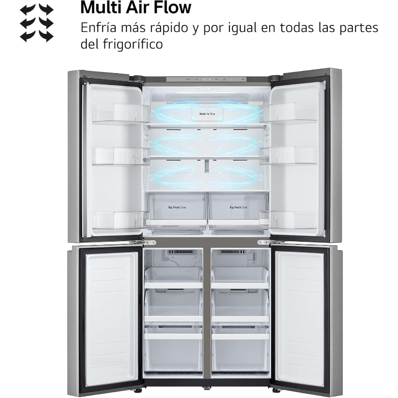 Este frigorífico LG es grande, enfría rápido y de forma uniforme, no hace escarcha, gasta poca electricidad y es silencioso. Tiene cajones especiales para conservar mejor frutas, verduras, carne o pescado. Puedes controlarlo desde el móvil y tiene espacio suficiente para toda la compra de una familia. Es práctico, moderno y fácil de usar.