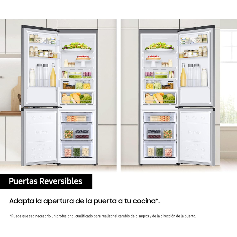 El Samsung RB34C602DSA/EF es un frigorífico combi de libre instalación con una capacidad total de 344 litros, diseñado para hogares que buscan eficiencia energética, organización interna optimizada y un diseño moderno en acero inoxidable. Es adecuado para familias medianas o personas que desean conservar alimentos frescos durante más tiempo con un consumo energético reducido.