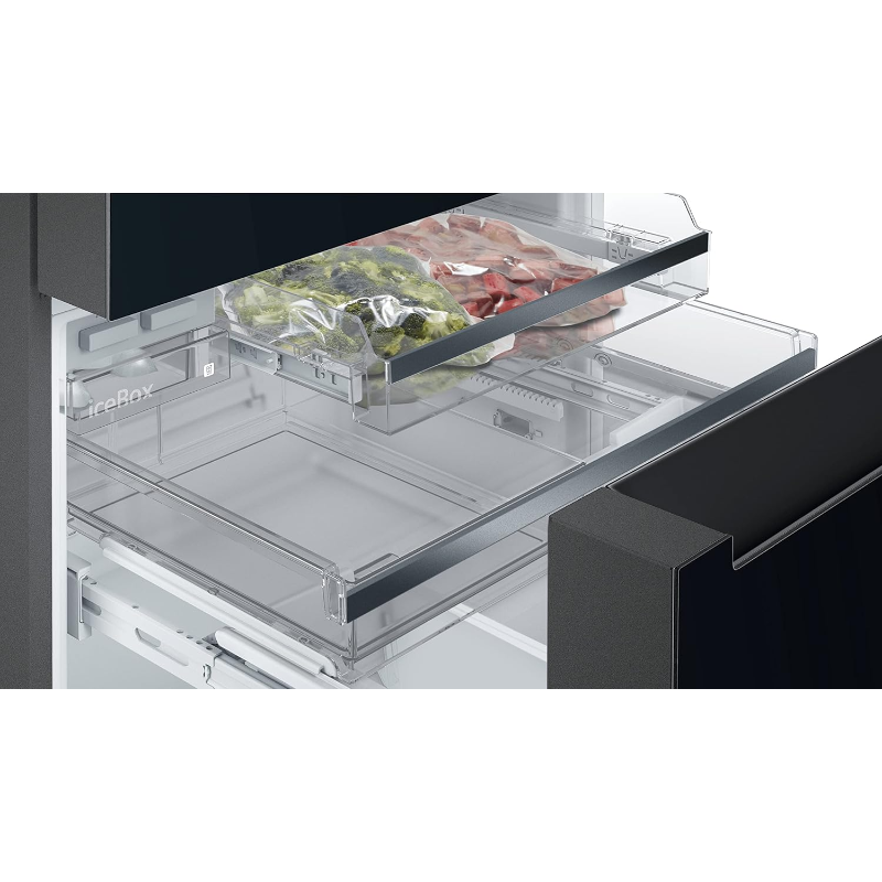 El Siemens KF96RSBEA 183×90.6 es un frigorífico americano No Frost de libre instalación, diseñado para ofrecer una solución de refrigeración y congelación de gran capacidad y alto rendimiento. Su diseño en color negro y acabado en acero inoxidable antihuellas lo hace adecuado para cocinas modernas y espacios amplios. Está pensado para familias numerosas, hogares con alto consumo de alimentos frescos y congelados, o personas que valoran la organización y la tecnología en la conservación de alimentos.